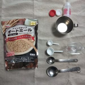 大さじや小さじがないときの代用品になるペットボトルキャップでも、オートミールを計量してみました。