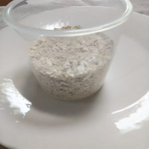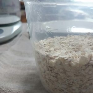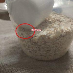 オートミール30gは計量カップでは100mlのメモリの少し下くらい。