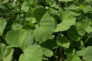 ふきは花の時期が終わると、地中から長い茎(葉柄)を伸ばして成長します。この部分が、いわゆる食用としての「ふき」です。葉は大きくて丸く、傘のように広がるのも特徴的です。