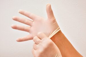 使い捨ての手袋を重ねてつけたり、防水性のエプロンを着用すると、より安全性が高まります。